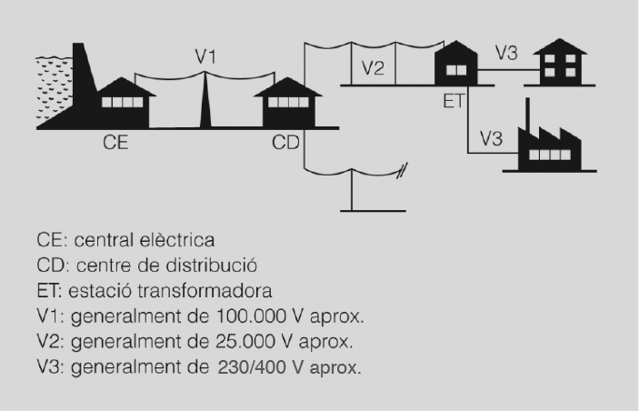 L’energia es genera en una central aprofitant un salt d’aigua, amb energia tèrmica, nuclear o d’altres (vegeu figura).