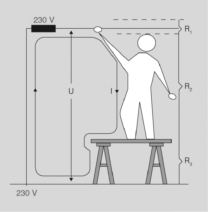 - R1 o resistència del punt de contacte: depèn dels materials que recobreixen la part del cos que entra en contacte amb el corrent; així doncs, dependrà de la roba, els guants, etc. que l’operari tingui en el punt de contacte. En cas que el contacte sigui directe amb la pell, el seu valor serà nul.