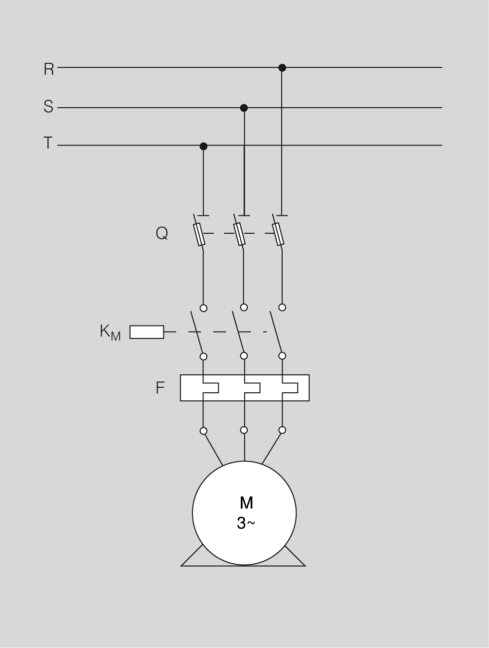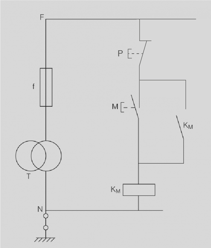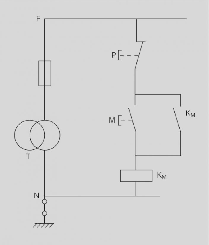 - Arrencada mitjançant contactor K (figura): la interrupció de l’alimentació provoca la desconnexió del contactor; en restablir-se la tensió cal accionar el polsadorM M per posar la màquina en marxa.