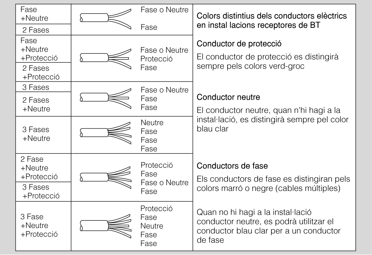 Els conductors de protecció seran de coure i presentaran el mateix aïllament que els conductors actius, s’instal·laran a la mateixa canalització i s’identificaran pel seu color (figura).