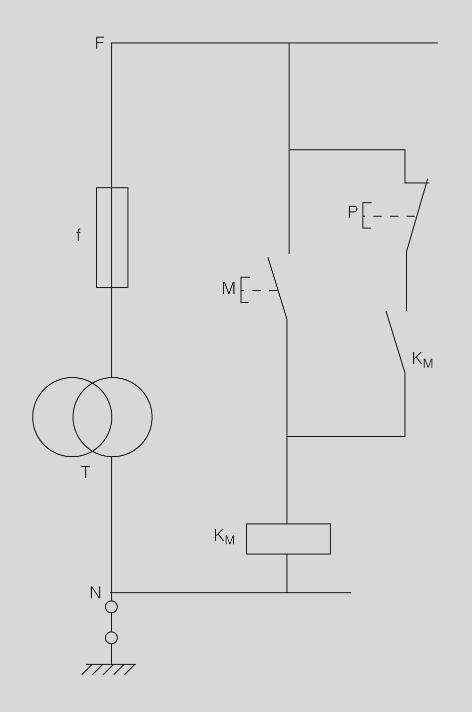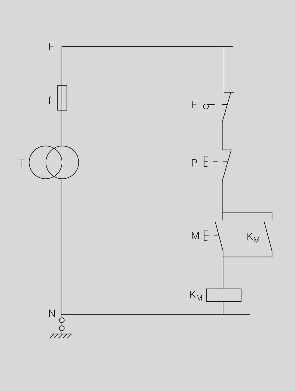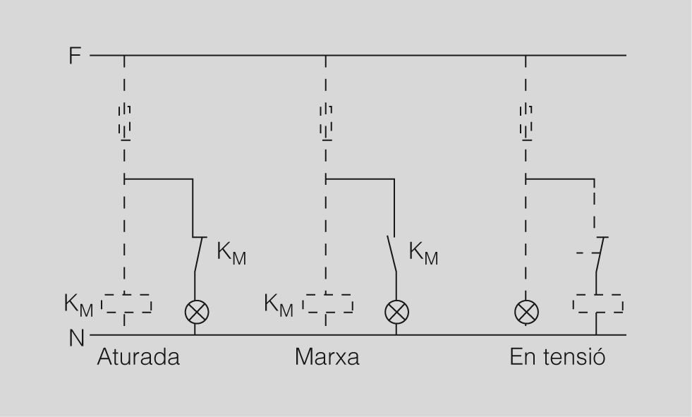 - Circuit de comandament(figura). És el circuit monofàsic, o eventualment a corrent continu, utilitzat per ordenar, governar, avisar, amidar, etc. els elements de funcionament de la màquina i permet assegurar la protecció elèctrica del circuit de potència (sobrecàrregues, etc.), la seguretat del personal encarregat del seu funcionament i en certa manera la seguretat dels elements mecànics.