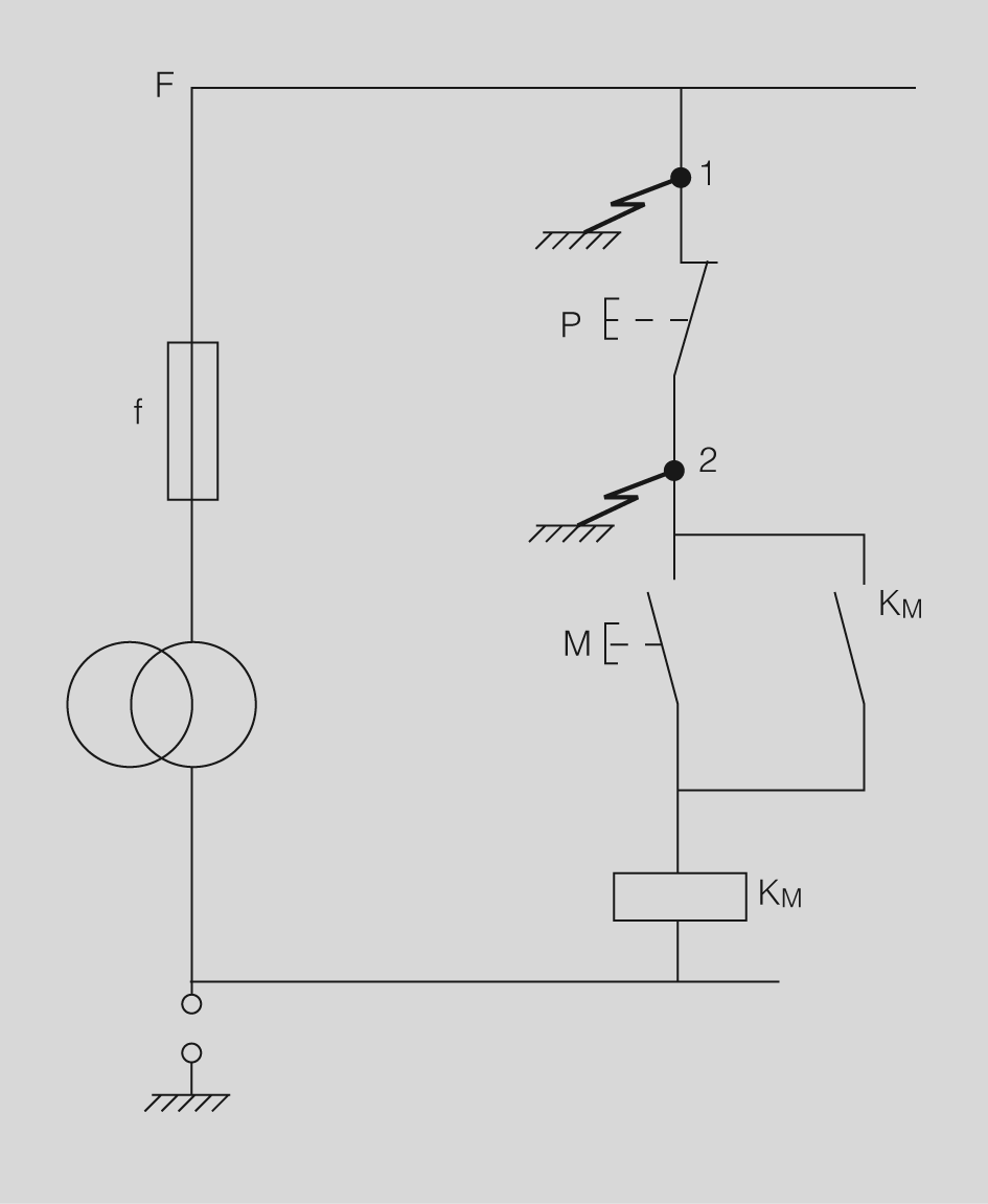 - Esquema de concepció errònia (figura). Circuit no connectat a terra: el primer defecte en el punt 1 no influeix en la maniobra però no és detectat; en l’aparició del segon defecte 2, una vegada engegada la màquina ja no podrà aturar-se.