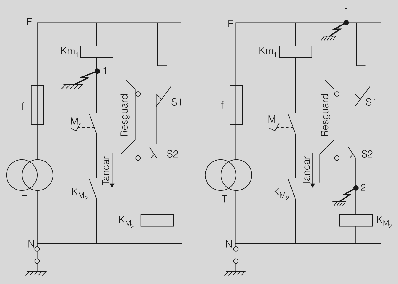 - Esquema de bona concepció (figura). L’aparició del defecte en el punt 1 provoca la fusió del fusible f. Si el defecte apareix en el punt 2, en tancar el resguard serà quan salti el fusible f. La maniobra és segura.