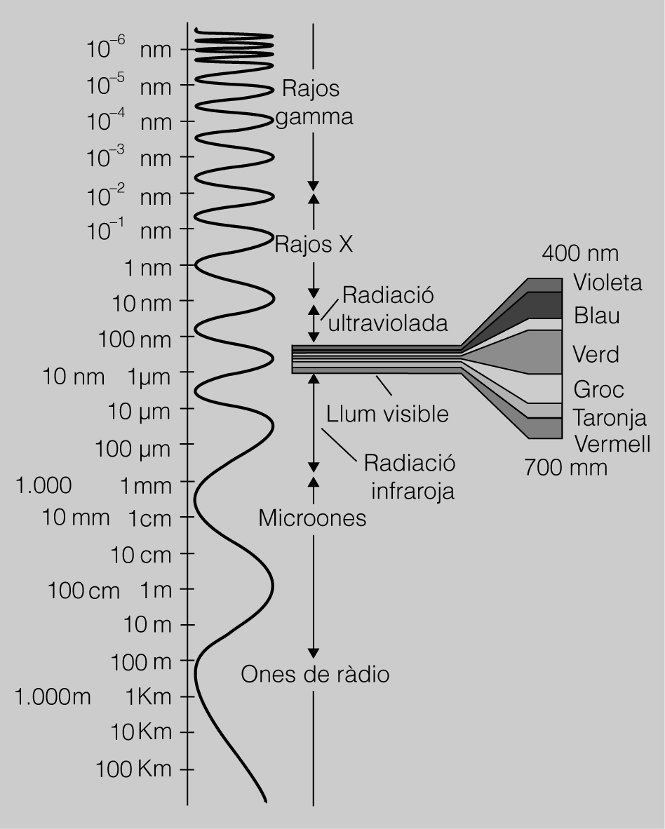 D’aquesta manera, es configura l’espectre electromagnètic, que va des d’unes ones de freqüència extremament baixa, com els camps electromagnètics originats per les línies d’alta tensió elèctrica, les ones de ràdio i comunicacions, les microones, passant per les radiacions òptiques, fins als rajos X i gamma.