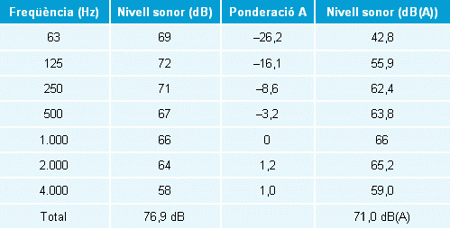 Calculeu el nivell sonor en dB i en dB(A) d’un soroll mesurat en bandes d’octava de l’espectre sonor següent: