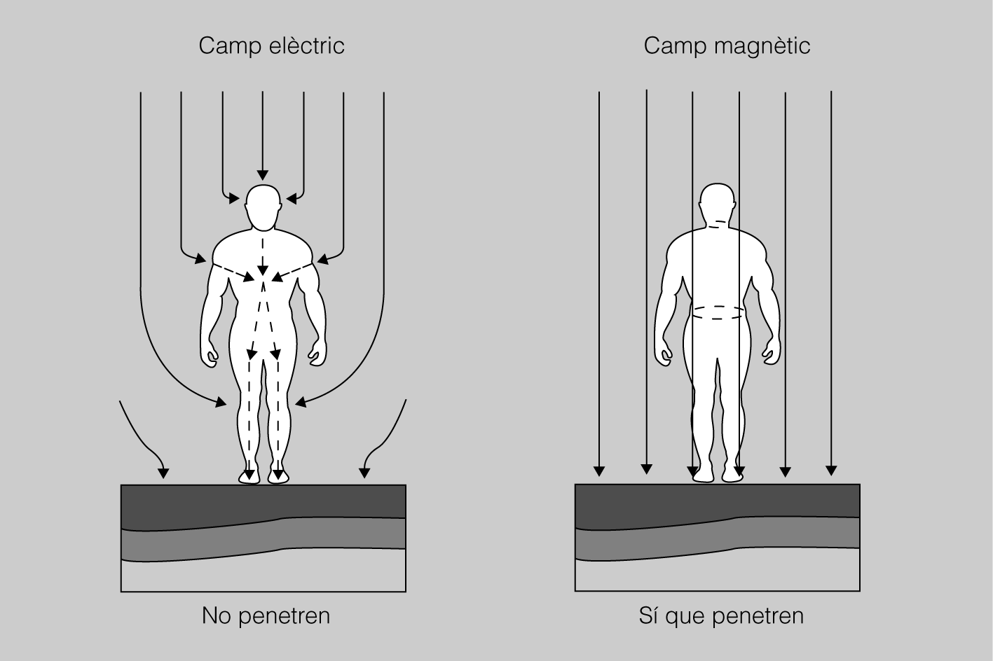 Resumint, els camps elèctrics estàtics (camps electroestàtics) no poden penetrar dins l’organisme, però els camps magnètics sí que poden, i produeixen camps elèctrics a l’interior (figura).