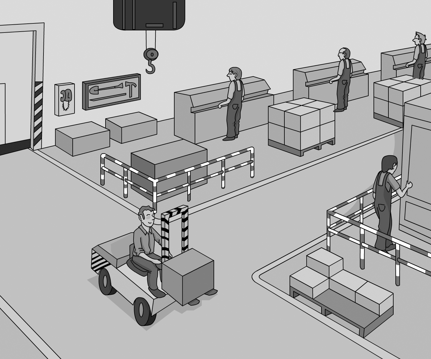La DEP a les indústries té per objectiu “ordenar convenientment els espais existents en tots i cada un dels llocs de treball, els d’aquests entre si i respecte a les instal·lacions i serveis auxiliars, per aconseguir que el flux de materials es faci amb la màxima seguretat, confort i al mínim cost possible”.
