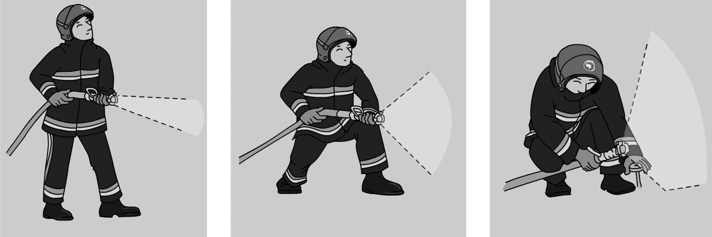 Com que els focs de tipus B s’originen a partir de líquids o sòlids liquats, a l’hora d’atacar-los (figura) hem de tenir em compte els aspectes següents: