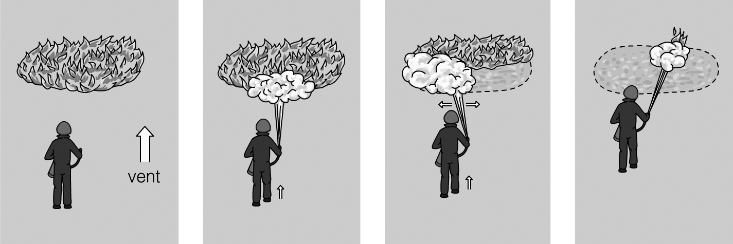 No s’ha d’aplicar aigua al fum per tal d’extingir el foc, ja que és innecessari, i a més altera el balanç tèrmic.