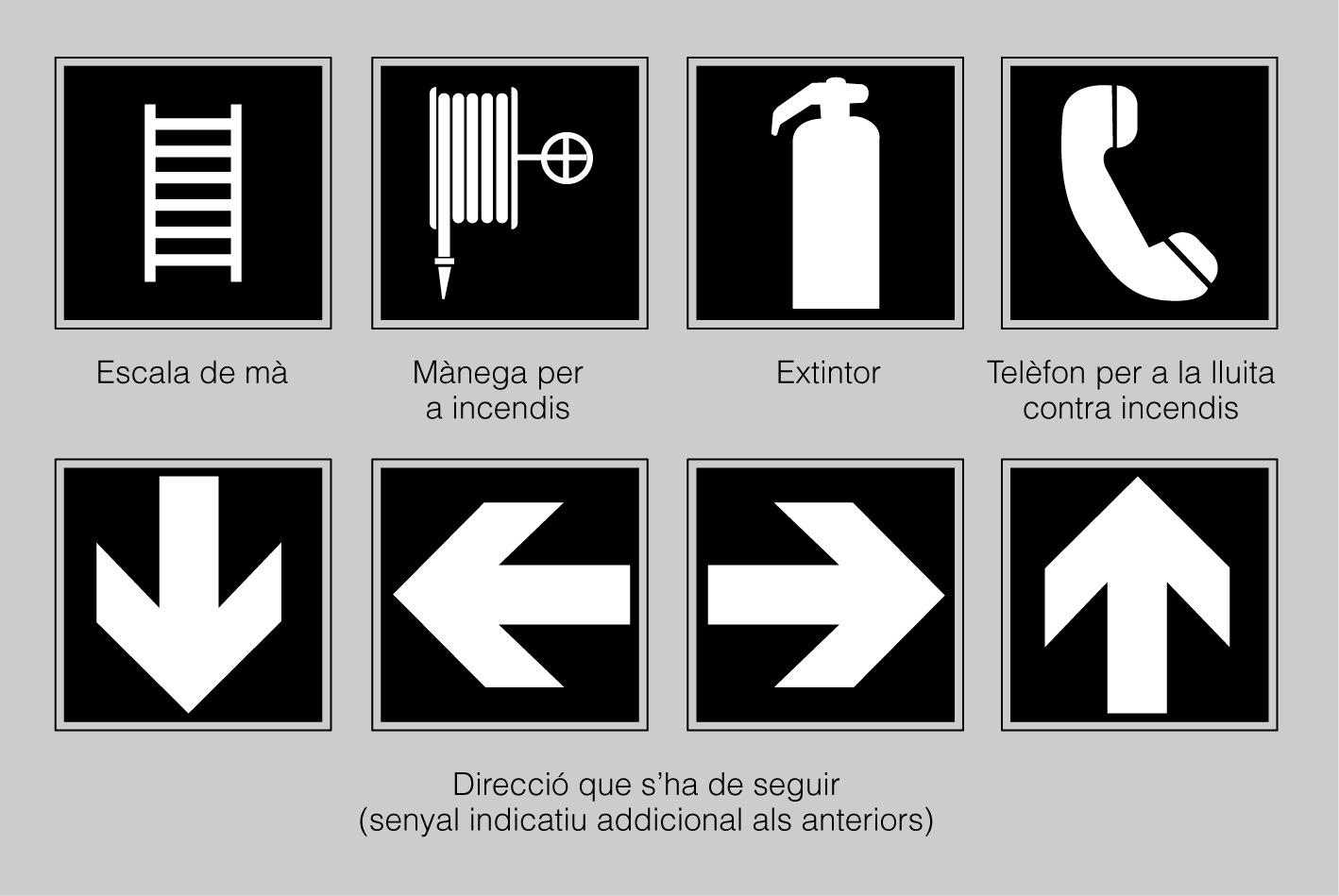 - Senyalització dels equips de lluita contra incendis. Aquests senyals són de forma quadrada. El pictograma és blanc sobre fons vermell, i el vermell ha de cobrir com a mínim el 50% de la superfície del senyal (vegeu la figura).