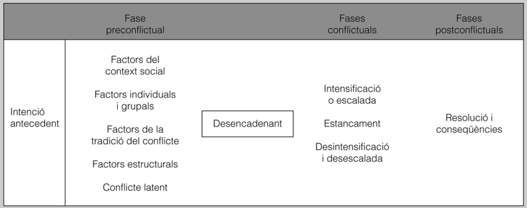 En la dinàmica del conflicte poden diferenciar-se tres fases: la fase preconflictual, en què el conflicte està latent, encara no s’ha manifestat; la fase conflictual i la fase post conflictual (figura):