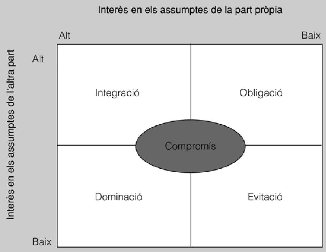 | Compromís | Cal una solució temporal a un problema complex. Les parts són igualment poderoses. Els objectius de les parts són mútuament excloents. El consens no s’ha pogut assolir. Els estils integradors i dominadors no han donat resultats. | El problema és suficientment complex per requerir un enfocament de resolució de problemes. Una part és més poderosa que l’altra. |