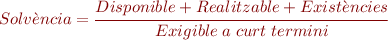 El coeficient ha de ser superior a la unitat perquè hi hagi líquid suficient. Quan és més petit que la unitat, hi ha un mínim per a cada empresa que l’acosta a la suspensió de pagaments. Es corregeix equilibrant els cobraments i les obligacions de pagament a curt termini. Quan és molt superior a la unitat, posa de manifest un excés de líquid, que també s’ha de corregir. - Solvència. Analitza la solvència de l’empresa davant els creditors a curt termini. També s’anomena distància la suspensió de pagaments, i alguns autors l’anomenen coeficient de líquid.