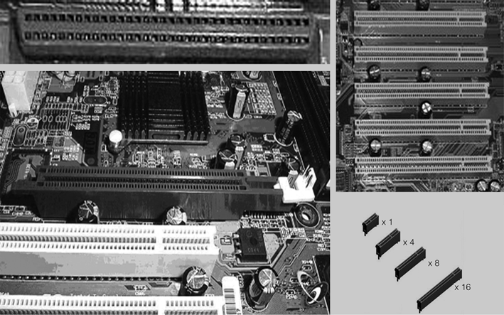 - PGA (acrònim anglès de pin grid array). Es tracta d’un sistema per a antics processadors 286, 386 i 486. Malgrat que n’hi ha diversos submodels depenent del processador concret, la forma general consistia en una quadrícula plena de petits connectors on s’introduïen els pius del xip del processador a pressió.
