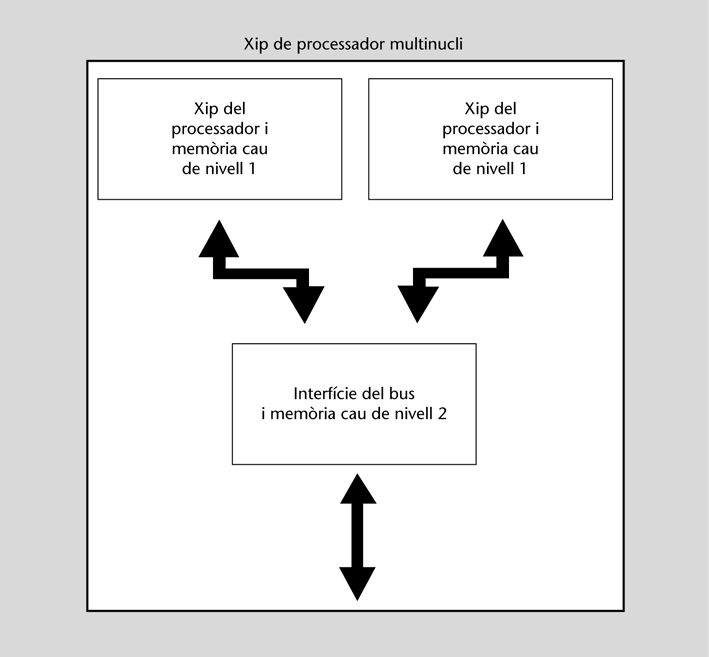 Una altra tendència per a optimitzar el rendiment dels ordinadors és el multiprocessament (en anglès, multiprocessing), que consisteix en l’ús de dos o més processadors interconnectats dintre d’un sol ordinador. Quan els diversos processadors estan integrats en un mateix xip, com és el cas del processador Intel Core 2 Duo, es parla de chip-level multiprocessing (multiprocessament a escala de xip) o de xip multinucli. Vegeu l’esquema d’aquest xip a la figura.