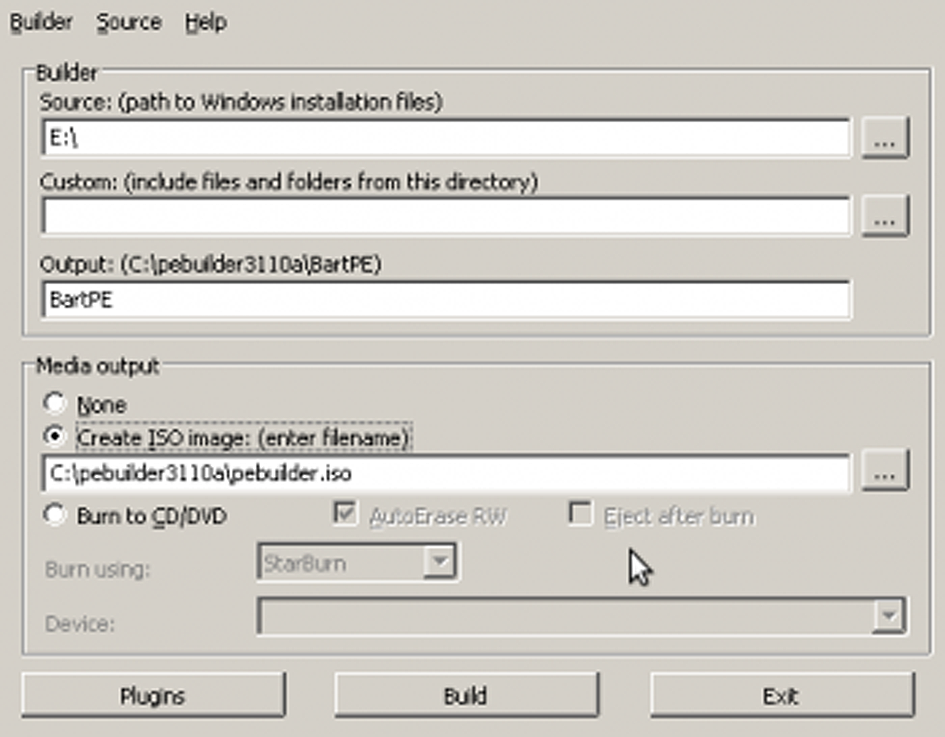 Un programari per crear imatges ISO de sistema basades en Windows mitjançant el mètode Bart PE, el PE Builder (figura), que va ser creat per Bart Lagerweij amb llicència gratuïta. Per utilitzar-lo cal disposar d’una còpia legal de Windows XP o Windows Server 2003.