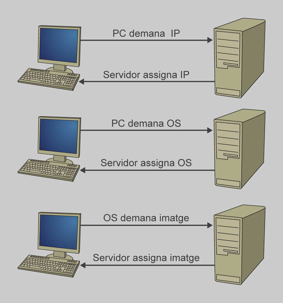 - El client s’engega i mitjançant el microprogramari que conté el codi d’arrencada PXE es demana una adreça IP. (Un client PXE pot ser un servidor, un ordinador de sobretaula, portàtil o qualsevol equip que disposi del codi d’arrencada PXE.)