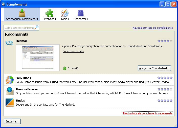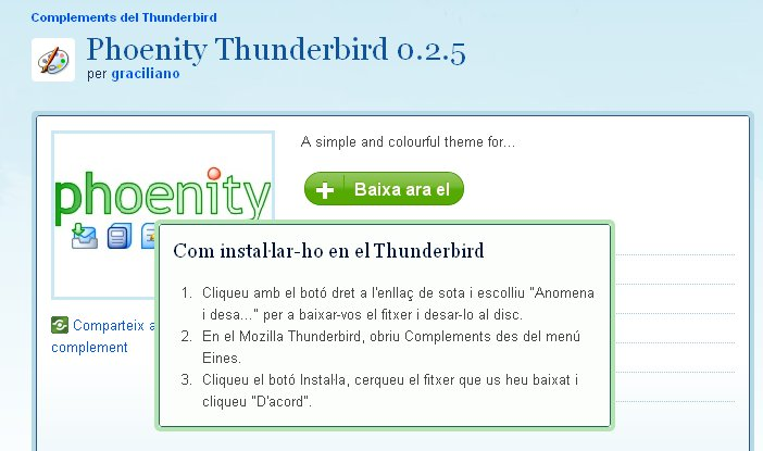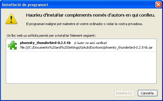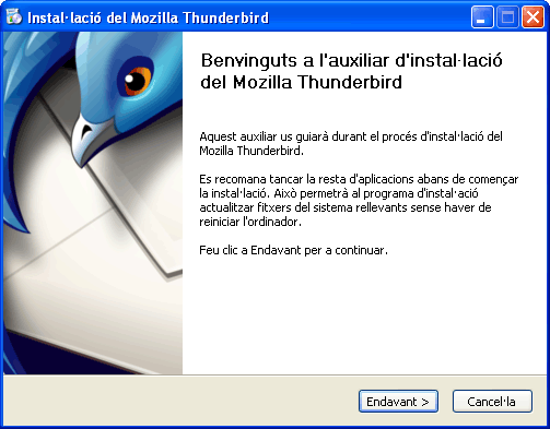 Per exemple, si provem d’instal·lar el gestor de correu Mozilla Thunderbird (http://www.mozilla-europe.org/es/products/thunderbird/), que, segons la versió, té una mida aproximada de 6,3 MB per al Windows, veurem que només s’han de seguir les instruccions que van sortint a la pantalla. En la figura podeu veure la pantalla d’inici que ens guiarà en la instal·lació.
