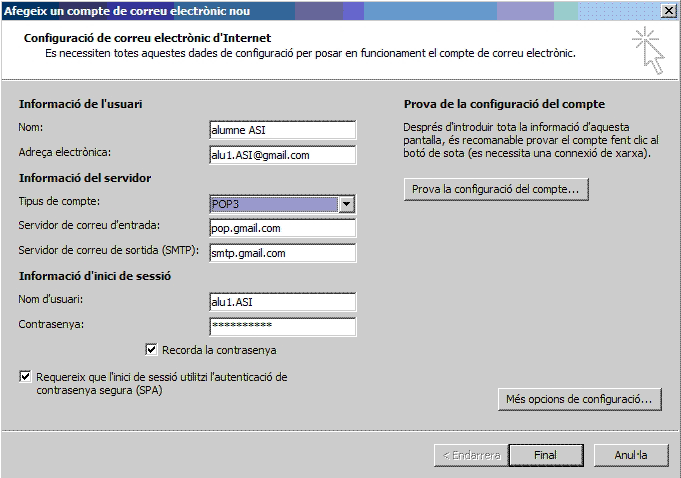 També haurem de donar les dades dels protocols SMTP i POP3 del compte de correu que volem baixar, ja que, per utilitzar el gestor de correu, cal que estigui vinculat a un compte de correu electrònic que és el que utilitzarem per rebre i enviar missatges.