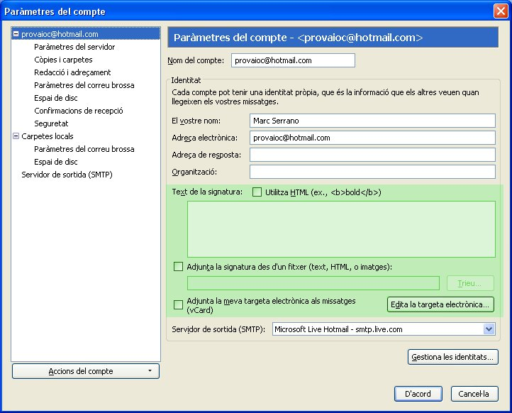 Fixeu-vos que, fins i tot, hi podem posar una fotografia. Si volem editar les dades, només cal seleccionar l’adreça en qüestió i fer clic en el botó Propietats de la barra d’eines. També tenim l’opció de suprimir el compte: Suprimeix o enviar un correu electrònic: Redacta.