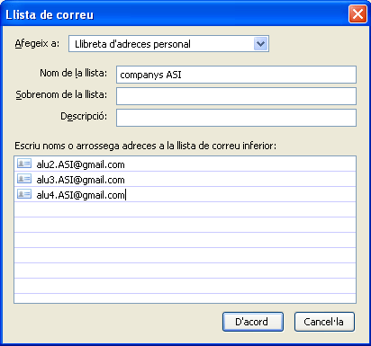 Primerament posem el nom a la llista, el sobrenom (si ho volem) i la descripció (també és opcional) (figura). Després, només cal començar a escriure les adreces i el programa les acaba de completar si són en la llibreta d’adreces.