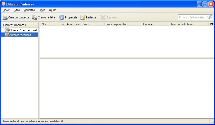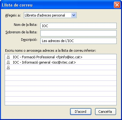 Vegem l’última opció de la barra d’eines: Crea una llista. Aquesta opció ens permet crear llistes d’adreces (per exemple, Amics, Companys de l’IOC, Veïns, etc.).