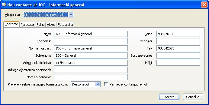 Podem introduir un contacte nou a la llibreta d’adreces, afegint si es vol més informacions com ara telèfons, buscapersones, fotografies, etc. Això ens dóna més informació i, a més, ens permet tenir una agenda detallada dels nostres contactes. Fixeu-vos bé en totes les opcions i pestanyes que té la finestra i ompliu les dades segons les vostres necessitats (figura). Per fer-ho, fem clic a Crea un contacte.