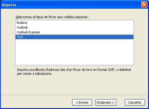 Triem l’opció de Llibretes d’adreces i fem clic a Endavant. Ara se’ns demana de quina aplicació volem importar la llibreta d’adreces. L’última opció, Text, és una importació des d’un arxiu en format LDIF, o delimitat per comes o tabulacions (figura).