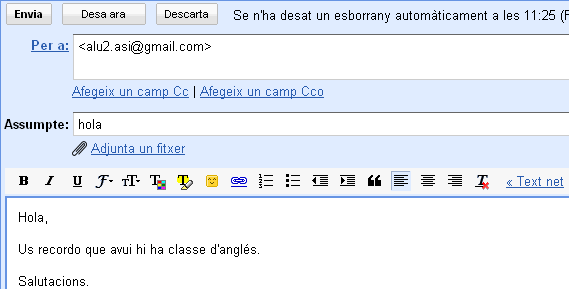 En aquesta figura també veiem que, a l’hora d’editar un missatge, podem utilitzar diverses opcions de format (negreta, cursiva, tipus de lletra, enllaç web, etc.), a més de comprovar l’ortografia en diversos idiomes i adjuntar un fitxer, o descartar o desar un missatge si encara no el volem enviar.