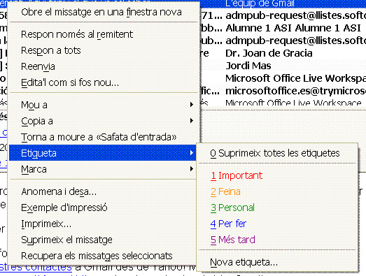 O, si seleccionem Nova etiqueta, en podem crear una de nova. Per accedir a les opcions d’etiqueta, també hi podem anar amb el botó d’accés directe Etiqueta o des del menú Missatge\Etiqueta. En la figura veiem una mostra de com s’afegeixen etiquetes.