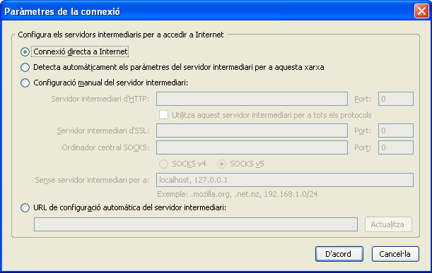 Clients de correu com el Thunderbird ofereixen la possibilitat de configurar aquests paràmetres, especificant si volem una connexió a Internet o si volem utilitzar un servidor intermediari. Per fer això hem d’anar a Eines\Opcions\Avançat\Xarxa i espai de disc i seleccionar Connexió, tal com podeu veure en la figura.