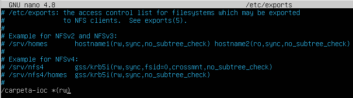 - :/carpeta-ioc: és la ubicació de la carpeta compartida dins el servidor. Ha de coincidir amb la informació entrada al fitxer /etc/exports.