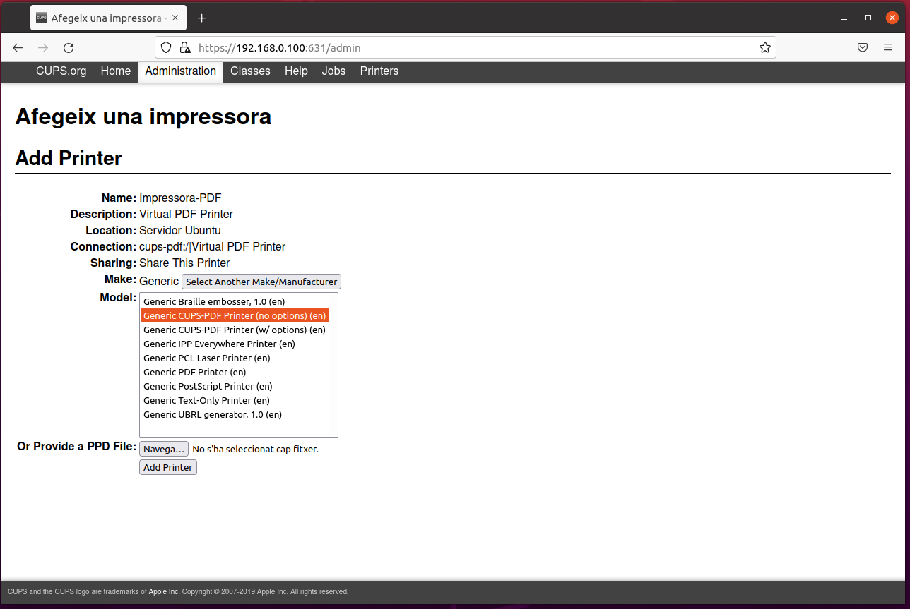 A continuació us demanarà quin fabricant i model té la impressora que voleu afegir. Seguint l’exemple, haureu de marcar Generic > Generic CUPS-PDF Printer no options > Add printer. A la figura es mostra aquesta opció: