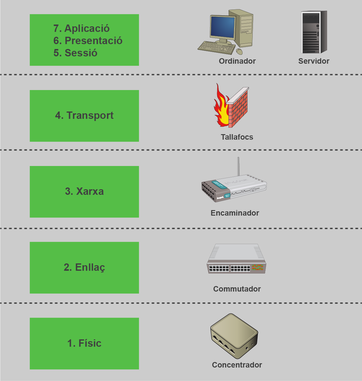 És important que tingueu clar en quina capa treballa cada dispositiu de xarxa i l’efecte que pot tenir que no funcioni correctament per poder estimar com pot afectar això el rendiment global de la xarxa. Si, per exemple, la connectivitat pateix talls intermitents, podem pressuposar un problema físic amb el cablatge o els connectors; en canvi, si tots els indicadors d’estat dels dispositius de cada extrem indiquen que hi ha connexió però no ens aconseguim connectar, ens podem centrar en la capa de xarxa i revisar l’adreçament IP.