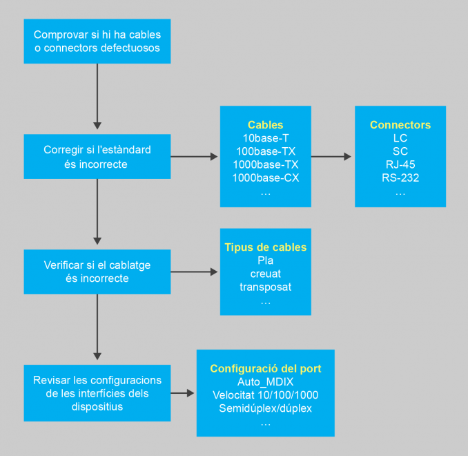 Si els cables i els connectors semblen en bon estat comproveu que els fils tinguin la configuració pertinent (cable pla, creuat o transposat) i que la configuració del port de connexió de l’equip sigui correcta, revisant que la velocitat (10, 100, 1000 Mbps, etc.) i el mode de funcionament (dúplex o semidúplex) siguin els mateixos als dos extrems. Podeu agafar com a referència l’esquema de la figura per tal de diagnosticar problemes relacionats amb els components físics.