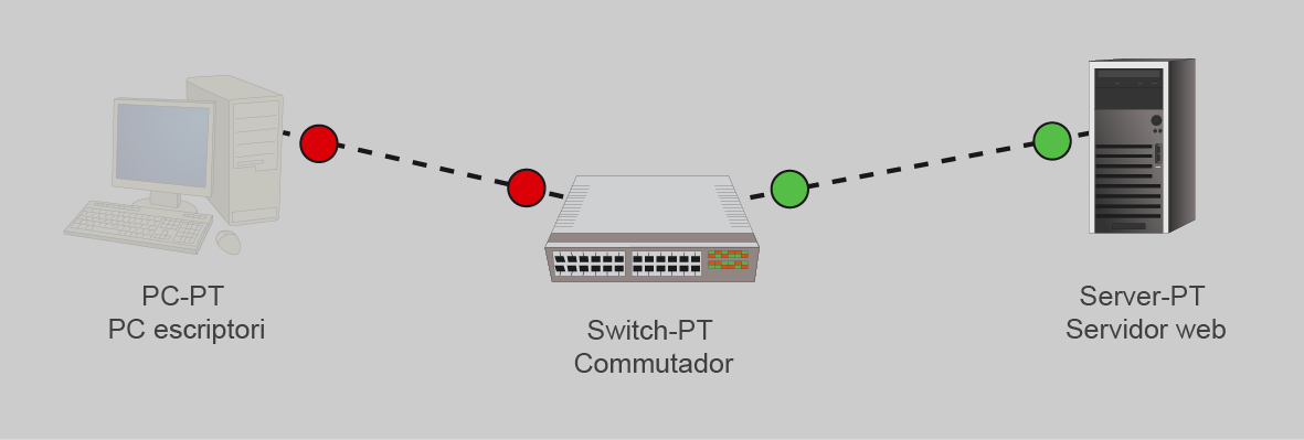 Com podeu veure, la connexió entre el PC i el commutador està en vermell, mentre que la connexió entre el commutador i el servidor està en verd. Això, si es tractés d’uns equips reals, seria l’equivalent a comprovar els LED de senyalització dels connectors de xarxa i dir que no hi ha connectivitat entre el PC i el commutador.