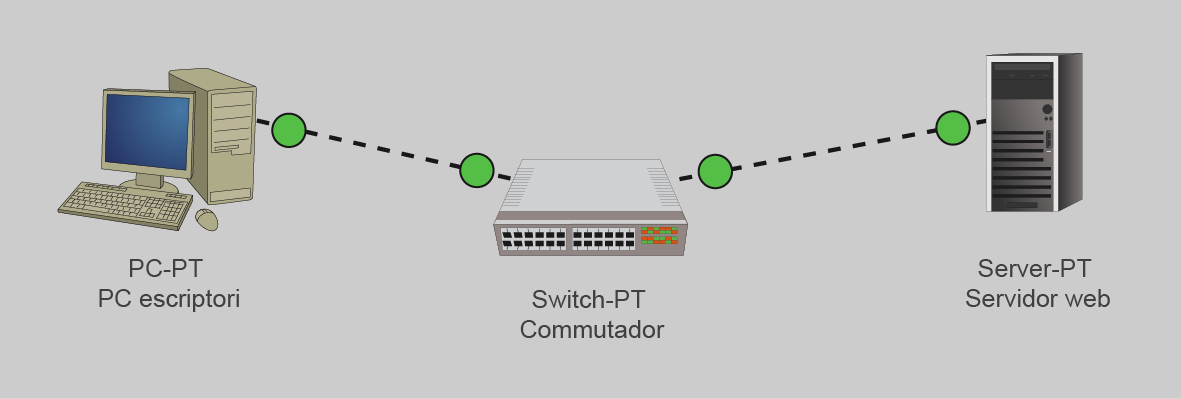 Amb una revisió més acurada podeu apreciar com el cable de xarxa que uneix el PC amb el commutador, que és el que no funciona, és de tipus discontinu, mentre que el que uneix el servidor amb el commutador és continu. Segons les especificacions dels packet tracer, el primer és de tipus creuat i el segon pla.