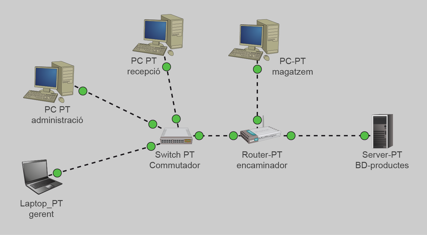 | Magatzem | 192.168.1.5 | 255.255.255.0 | 192.168.1.1 | Encaminador (Fa1/0) | PC escriptori |