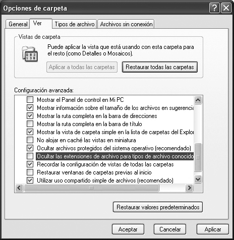 - Cal que configurem el Windows perquè ens mostri les extensions dels fitxers. D’aquesta manera, sabrem si es tracta d’un fitxer .doc del Word, d’un fitxer de text .txt o d’un programa .exe o .com. Les extensions .vbx, .pif o .shs són les que tenen més probabilitats de ser un virus. Per configurar el Windows d’aquesta manera, ho fareu per mitjà de les Herramientas\Opciones de carpeta\Ver. Desmarcareu l’opció Ocultar les extensions per a tipus d’arxius coneguts, tal com es mostra en la figura. També veureu clarament que es tracta d’un virus quan trobeu fitxers amb dobles extensions com, per exemple, .txt.exe.