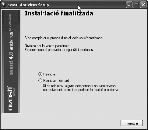 Quan ja disposeu d’un programa antivirus, sia comprat en una botiga, en línia o descarregat d’una pàgina repositori de programari lliure, cal que l’instal·leu en el sistema. Aquest procés normalment requereix poca atenció i acostuma a ser un “següent”. És sistemàtic si no és que voleu canviar el directori d’instal·lació o escolliu l’opció personalitzada per instal·lar només una part de les utilitats del programari. Una vegada acabada la instal·lació, us demanarà si voleu fer un escaneig quan reinicieu el sistema. Podeu escollir que no. Seguidament, us demanarà que reinicieu el sistema, tal com podeu veure en la figura. Feu-ho.