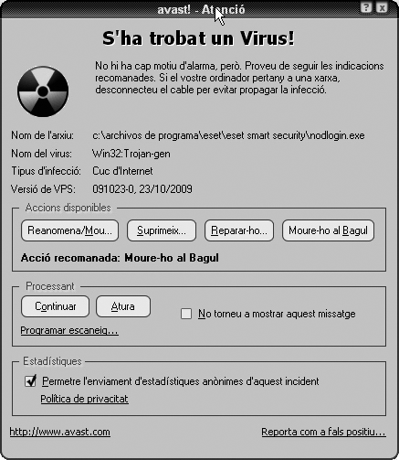 En la configuració també podeu indicar al programa què ha de fer quan trobi un virus i on l’ha de guardar, en cas que el guardi. Igualment, li podeu ordenar que l’elimini sempre que pugui o que us avisi o no quan en trobi un. La configuració també us ofereix la possibilitat d’automatitzar les tasques. De totes maneres, si no ho acabeu de veure clar, podeu deixar les opcions de configuració tal com s’han instal·lat. El programa funcionarà correctament.