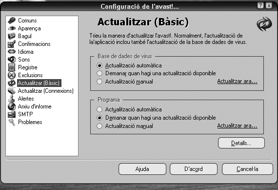 Això a part, també hi sol haver la possibilitat d’actualitzar el mateix programa antivirus (no la base de dades dels virus que van apareixent). És aconsellable que el mantingueu actualitzat, ja que així tindreu les utilitats noves de què disposi.