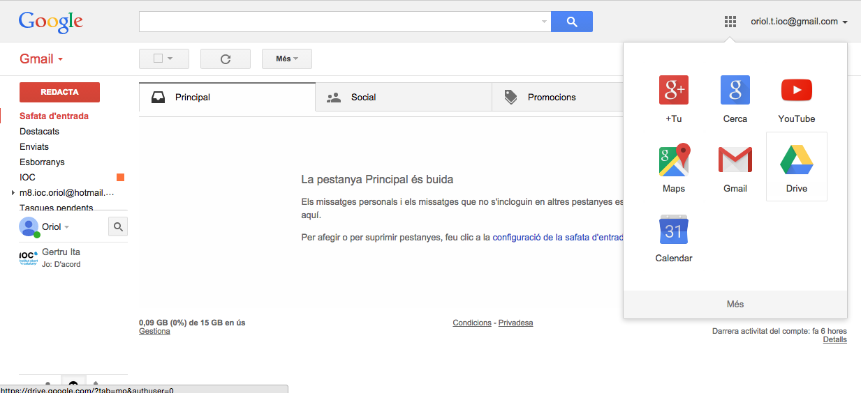 Val a dir que l’altra via per accedir al Google Drive és mitjançant el correu electrònic web de Google. En la cantonada dreta superior de la safata d’entrada de Google podem accedir als diferents serveis vinculats als comptes de Google on, entre ells, trobem el Google Drive (veure la figura).