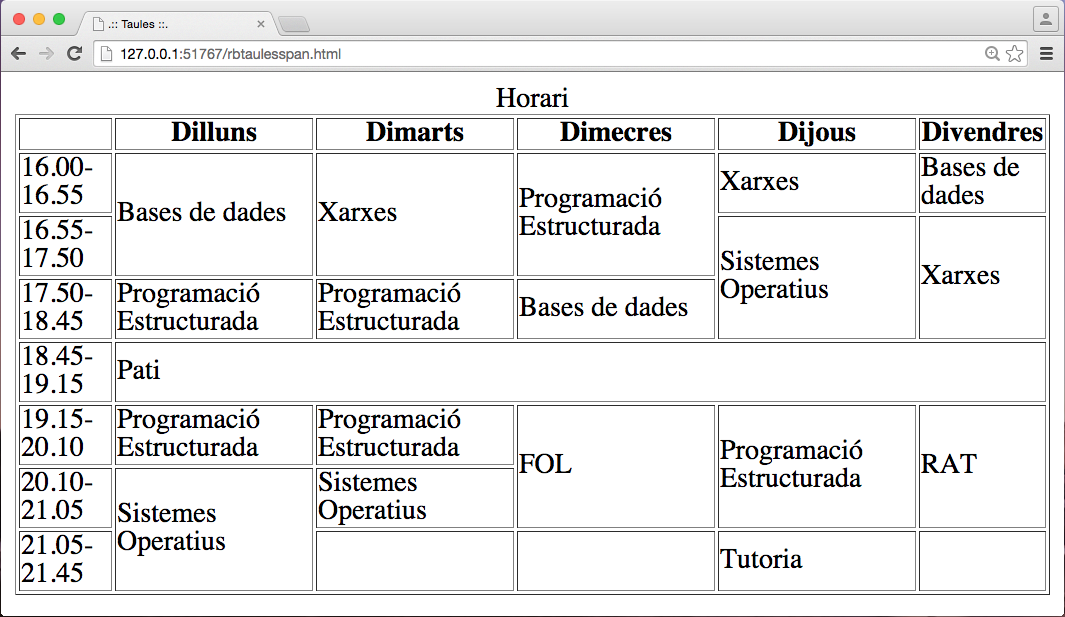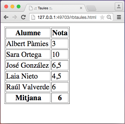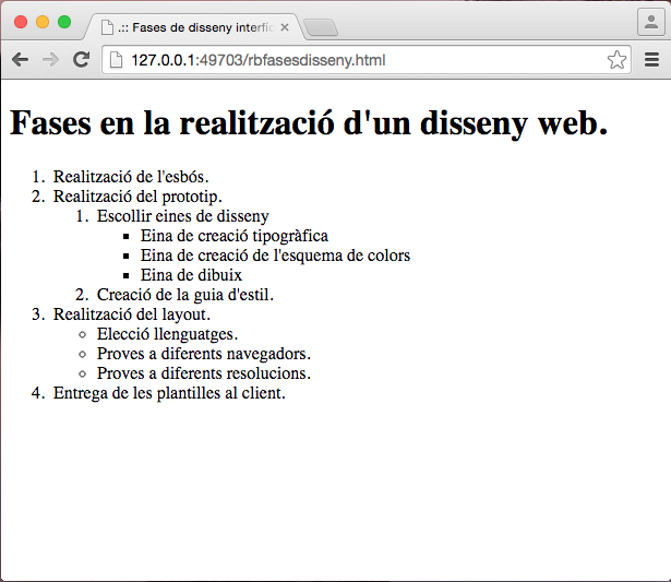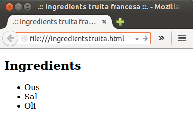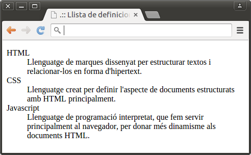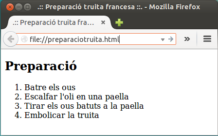 En la figura podeu veure com es visualitzaria aquest exemple en un navegador. Fixem-nos que, normalment, els navegadors posen un estil per defecte a cadascuna de les etiquetes. Així doncs, el text marcat amb <h1> és més gran que el marcat amb <h2>, aquest és més gran que el marcat amb <h3> i així successivament.