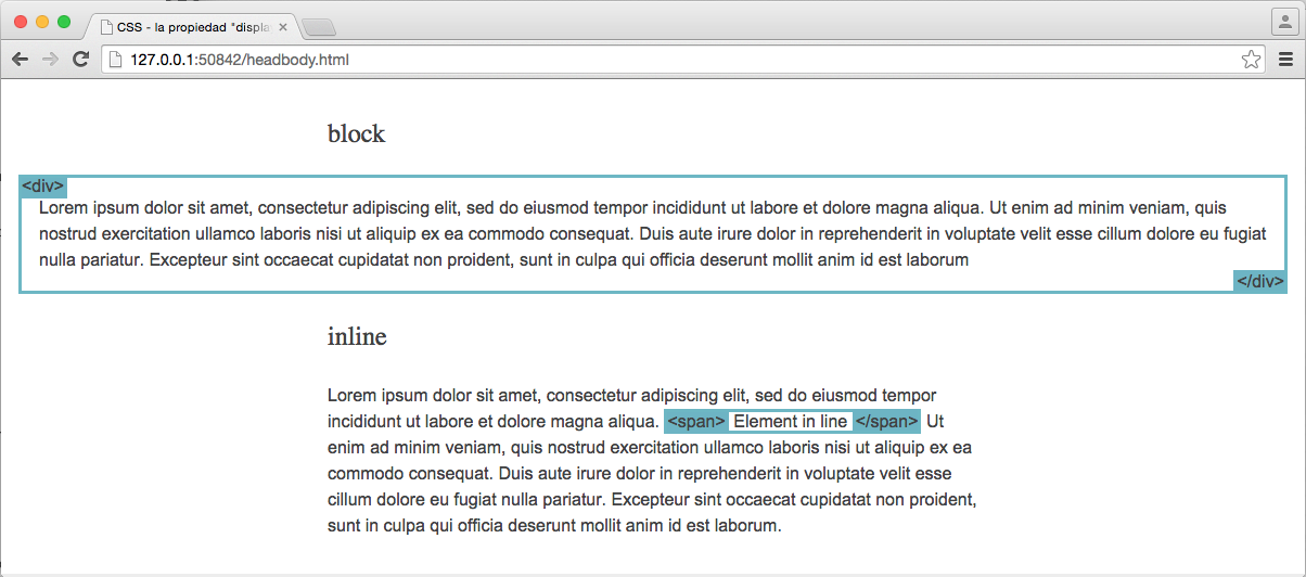 Normalment, el navegador mostra els elements de línia un al costat de l’altre, dins de l’element de bloc que els conté, o al seu defecte dins del document que representa l’etiqueta <body>. Podríem dir que un element de línia ocupa l’espai d’allò que conté, però no s’expandeix més enllà.