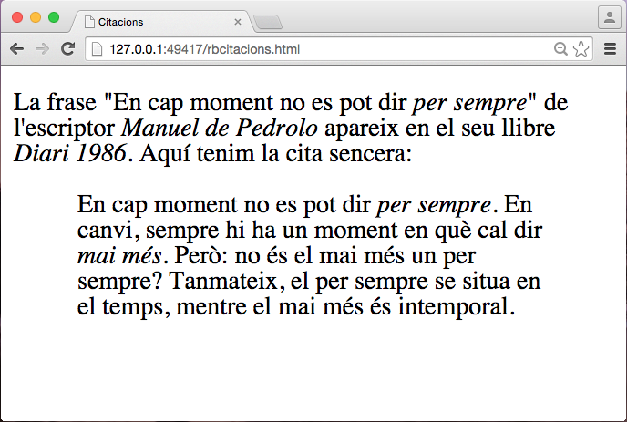 Posem un exemple d’ús d’aquestes etiquetes. Imaginem que estem fent un lloc web on volem posar una citació de l’escriptor Manuel de Pedrolo: