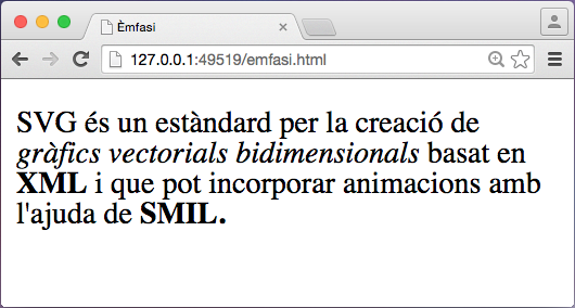 Per defecte, la majoria de navegadors mostren el text marcat amb <em> en lletra cursiva i el text marcat amb <strong> amb lletra negreta, com es veu en la figura.