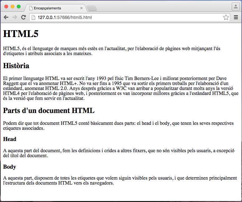 <h1>HTML5</h1> <p>HTML5 és el llenguatge de marques més estès en l'actualitat, per l'elaboració de pàgines web mitjançant l'ús d'etiquetes i atributs que hi estan associats. </p> <h2>Història</h2> <p>El primer llenguatge HTML va ser escrit l'any 1993 pel físic Tim Berners-Lee i millorat posteriorment per Dave Raggett que el va anomenar HTML+. No va ser fins a 1995 que va sortir els primers treballs per l'elaboració d'un estàndard, anomenat HTML 2.0. Anys després gràcies a W3C van arribar a popularitzar durant molts anys la versió HTML4 per l'elaboració de pàgines web, i posteriorment es van incorporar millores gràcies a l'estàndard HTML5, que és la versió que fem servir en l'actualitat.</p> <h2>Parts d'un document HTML</h2> <p> Podem dir que tot document HTML5 conté bàsicament dues parts: el head i el body, que tenen les seves respectives etiquetes associades. </p> <h3>Head</h3> <p>En aquesta part del document, fem les definicions i crides a altres fitxers, que no són visibles pels usuaris, a excepció del títol del document.</p> <h3>Body</h3> <p>En aquesta part, disposem de totes les etiquetes que volem que siguin visibles pels usuaris, i que determinen principalment l'estructura dels documents HTML vers els navegadors.</p>