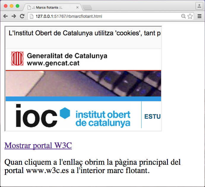 <iframe width="500px" height="400px" src="http://ioc.xtec.cat/educacio/" name="marcflotant_a"></iframe> <p><a href="http://www.w3c.es/" target="marcflotant_a">Mostrar portal W3C</a></p> <p>Quan cliquem a l'enllaç obrim la pàgina principal del portal www.w3c.es a l'interior del marc flotant.</p>