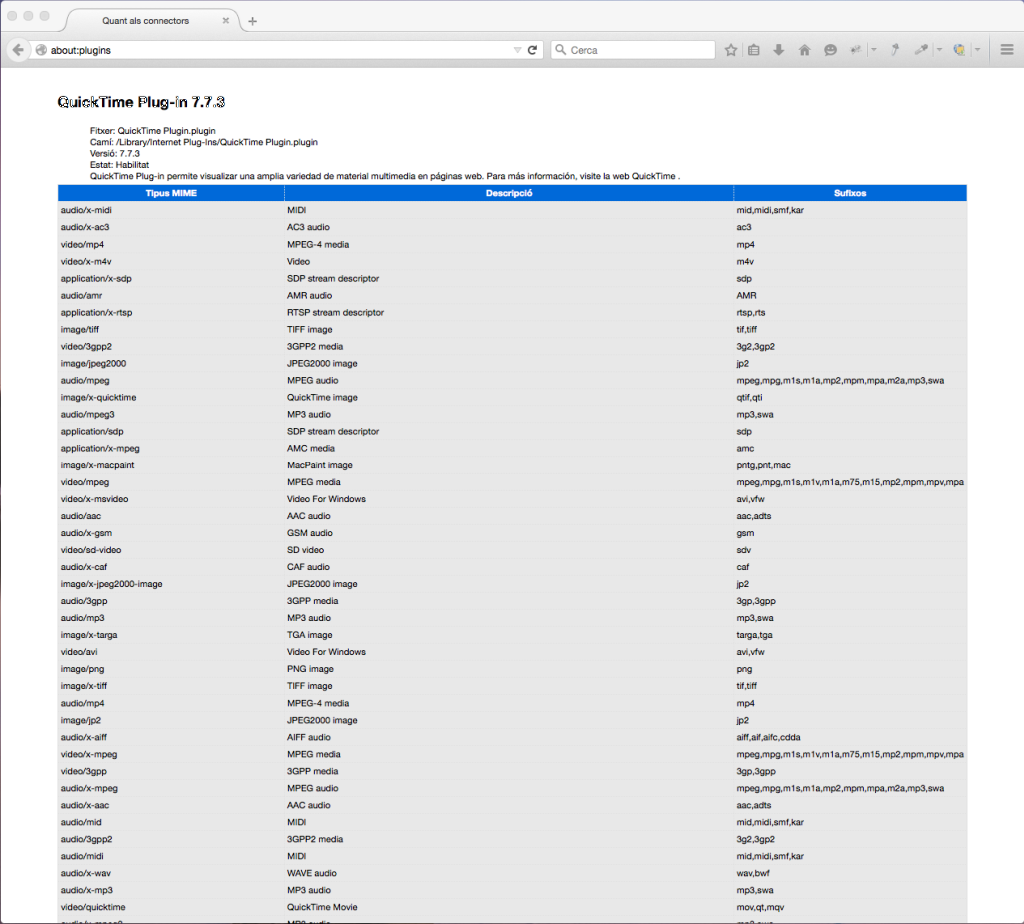 Si es vol saber els connectors que es tenen instal·lats al navegador Firefox s’ha d’escriure about:plugins a la barra de navegació. El navegador ens mostra un document HTML amb la informació corresponent de tots els connectors instal·lats, com es veu en la figura. La informació que dóna és molt interessant: connectors instal·lats (versió i nom del fitxer corresponent) i, per a cada connector, la relació de tipus MIME als quals pot donar servei.